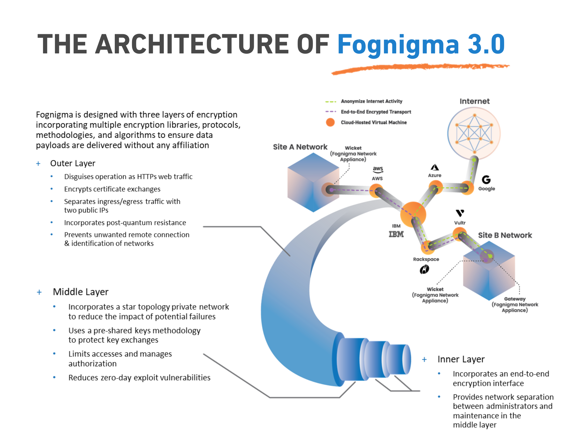 Fognigma is designed with a unique, three-layer encryption architecture that protects data during transfer, uses multiple encryption libraries, and incorporates quantum-resistance—all while disguising protection as typical web traffic.